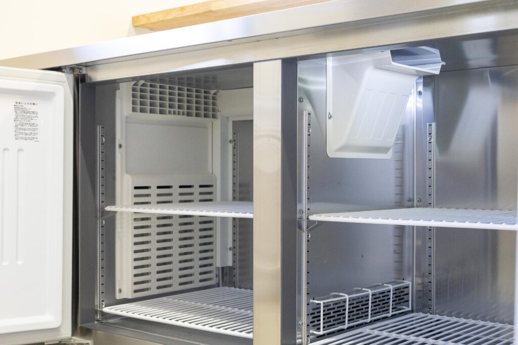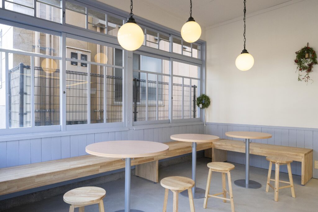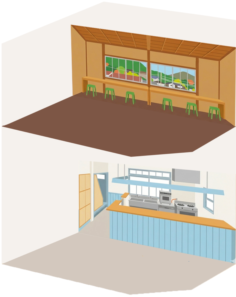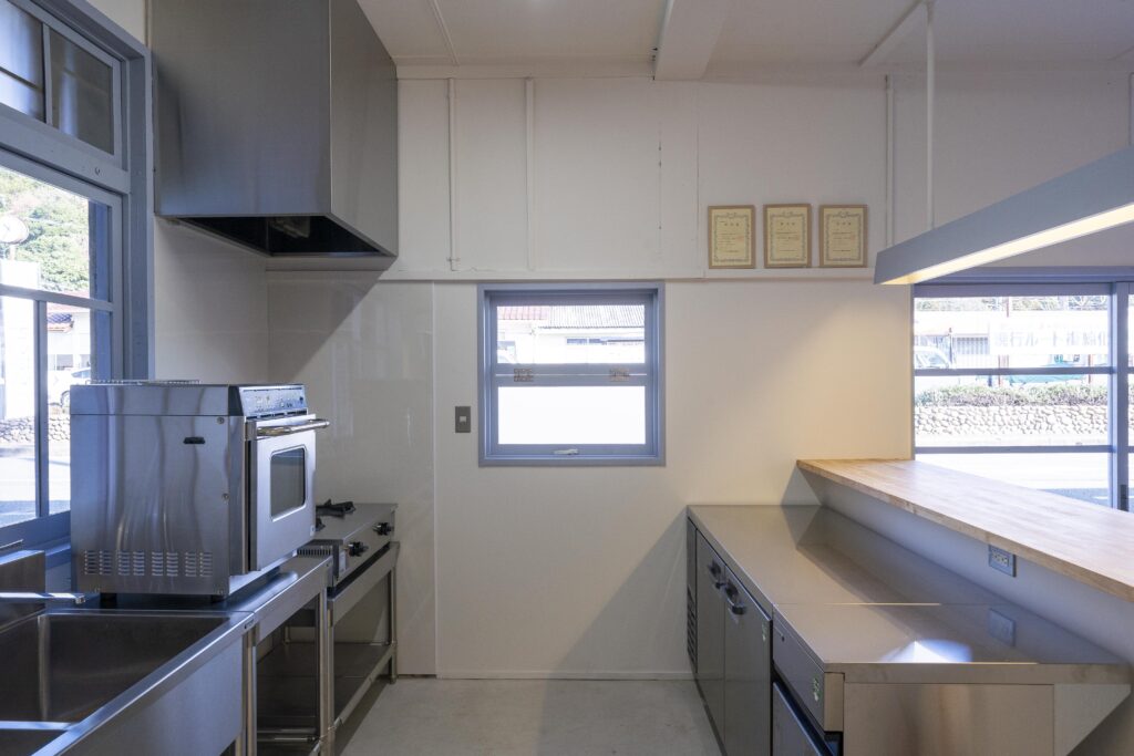 カフェスペースも備えたシェアキッチン。ガスオーブンをはじめ、業務用のガスコンロ、冷蔵・冷凍庫、製氷機など、仕込みから提供までを支える設備をしっかり完備しています。菓子製造や飲食営業など、やりたいことに合わせて柔軟に使えます。