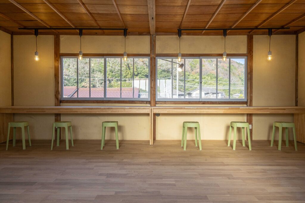ワークショップ、展示、イベントなど、さまざまな用途に使えるコミュニティスペース。大きな窓からは谷川駅舎や、山の景色が一望でき、心地よい時間が流れます。集まる人や目的に合わせて、自由にご活用ください。